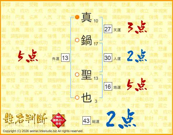 真(10画)鍋(17画) 聖(13画)也(3画)