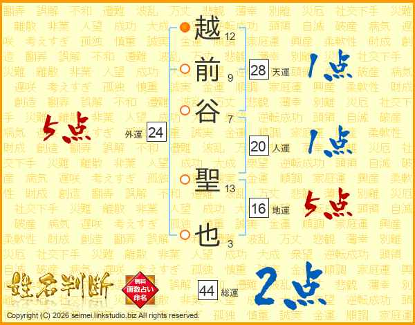 越(12画)前(9画)谷(7画) 聖(13画)也(3画)