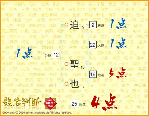 迫聖也さんの総運は25画の4点!