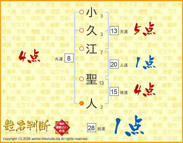 小(3画)久(3画)江(7画) 聖(13画)人(2画)