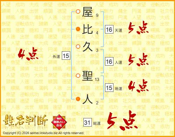 屋(9画)比(4画)久(3画) 聖(13画)人(2画)
