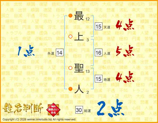 生活面を象徴する運勢です。外部から受ける影響力を表し、結婚運、家庭運や職場、環境への順応性を表します。総運から人運を引いた画数。姓や名が1文字の場合を除く。