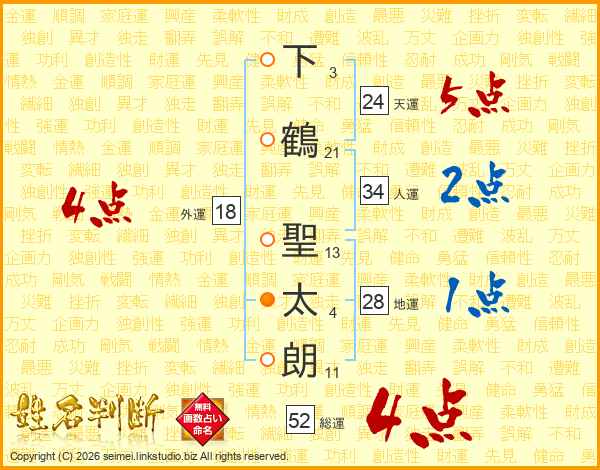 下鶴聖太朗さんの総運は52画の4点!