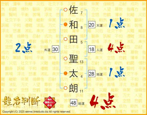 佐(7画)和(8画)田(5画) 聖(13画)太(4画)朗(11画)