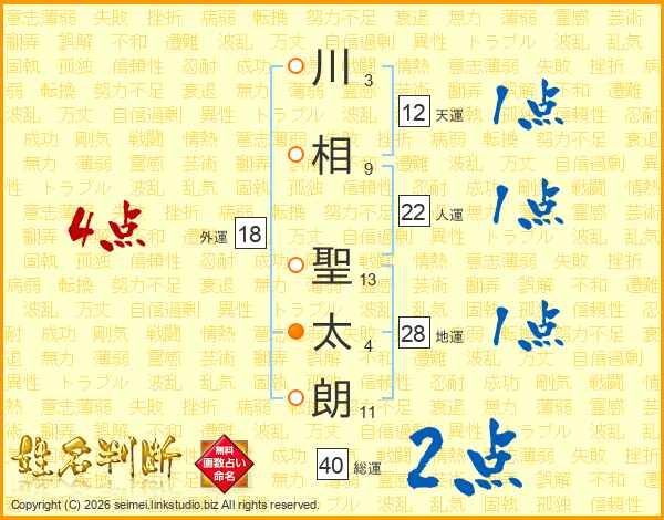 川(3画)相(9画) 聖(13画)太(4画)朗(11画)