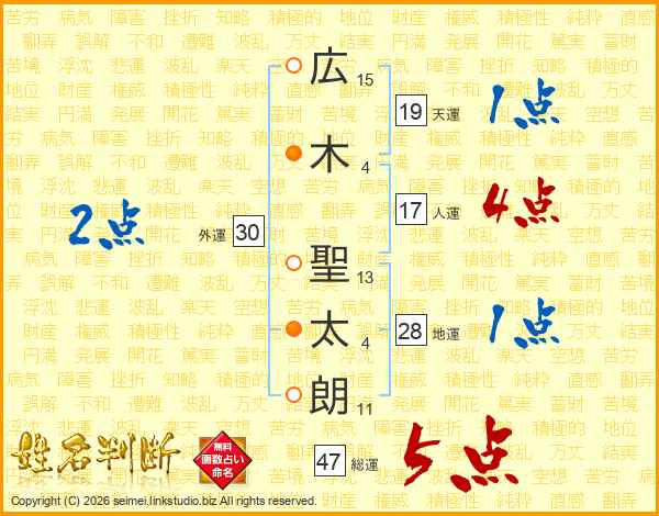 広(15画)木(4画) 聖(13画)太(4画)朗(11画)