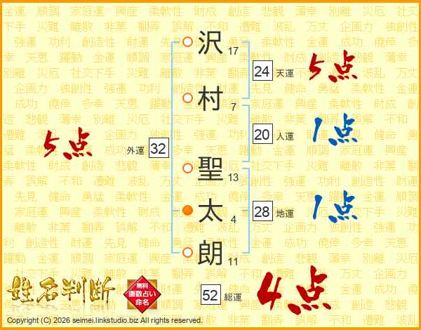 沢村聖太朗さんの総運は52画の4点!