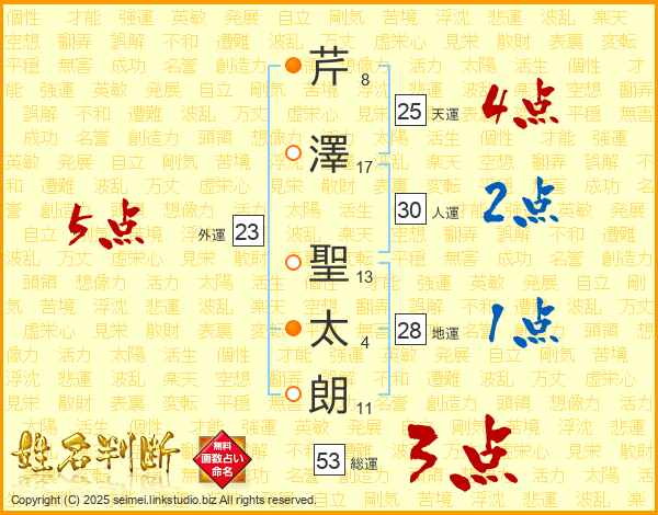 芹(8画)澤(17画) 聖(13画)太(4画)朗(11画)