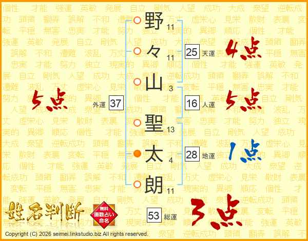 野(11画)々(11画)山(3画) 聖(13画)太(4画)朗(11画)