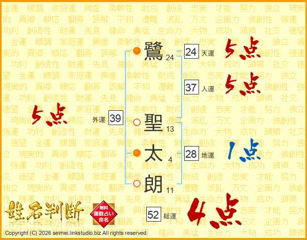 鷺(24画) 聖(13画)太(4画)朗(11画)