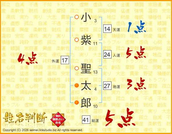 小紫聖太郎さんの総運は41画の5点!