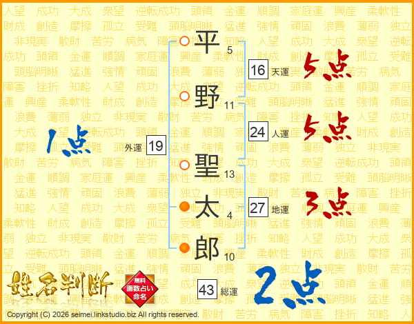平(5画)野(11画) 聖(13画)太(4画)郎(10画)
