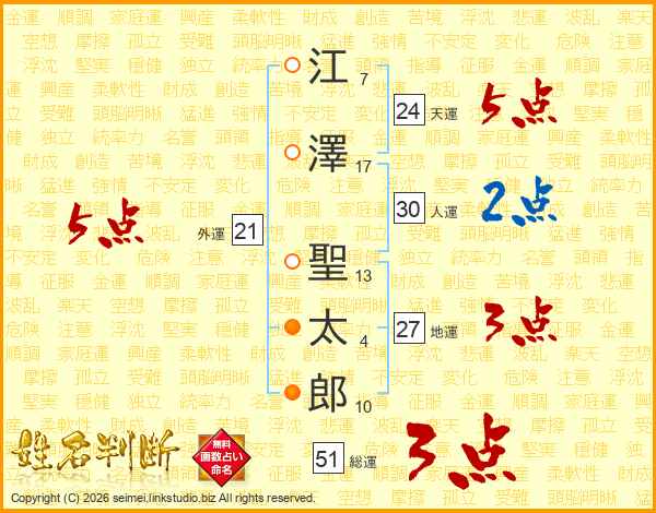 江(7画)澤(17画) 聖(13画)太(4画)郎(10画)