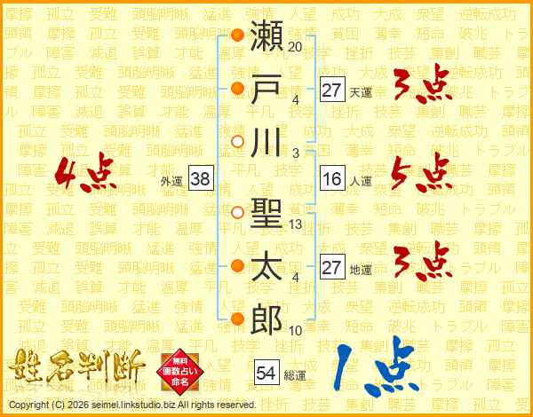 瀬(20画)戸(4画)川(3画) 聖(13画)太(4画)郎(10画)