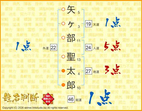 矢ヶ部聖太郎さんの総運は46画の1点!