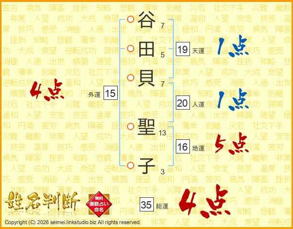 谷(7画)田(5画)貝(7画) 聖(13画)子(3画)