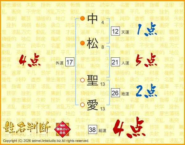 中松聖愛さんの総運は38画の4点!