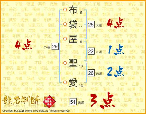 布(5画)袋(11画)屋(9画) 聖(13画)愛(13画)
