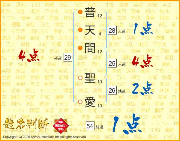 普(12画)天(4画)間(12画) 聖(13画)愛(13画)