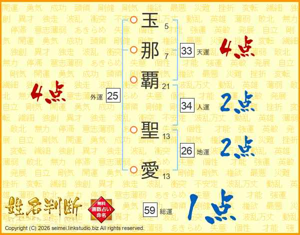 玉(5画)那(7画)覇(21画) 聖(13画)愛(13画)