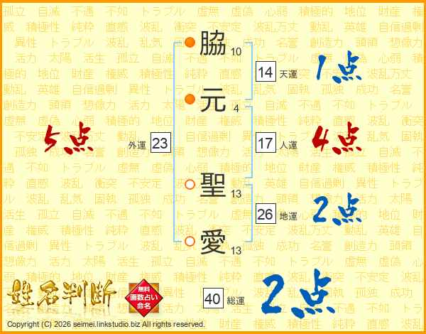 脇(10画)元(4画) 聖(13画)愛(13画)