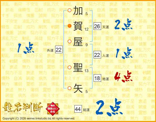 加賀屋聖矢さんの総運は44画の2点!