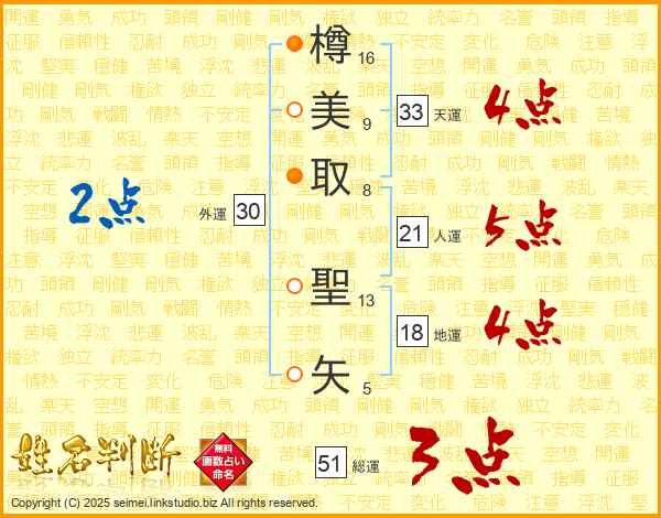 樽(16画)美(9画)取(8画) 聖(13画)矢(5画)