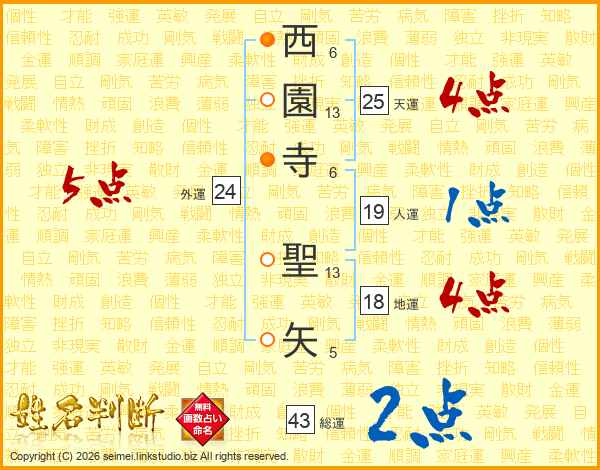 西園寺聖矢さんの総運は43画の2点!