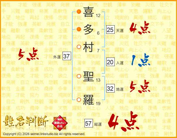 喜(12画)多(6画)村(7画) 聖(13画)羅(19画)