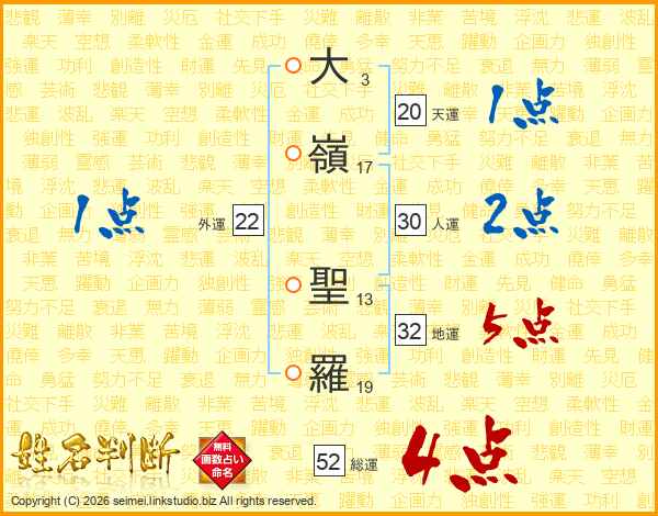 大嶺聖羅さんの総運は52画の4点!