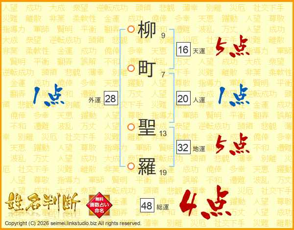 柳(9画)町(7画) 聖(13画)羅(19画)