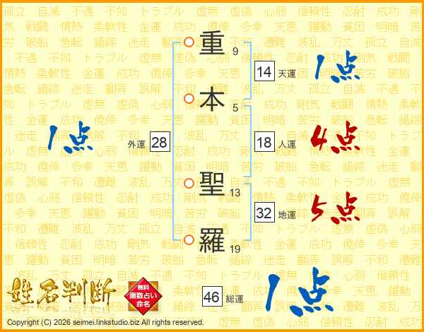 重(9画)本(5画) 聖(13画)羅(19画)