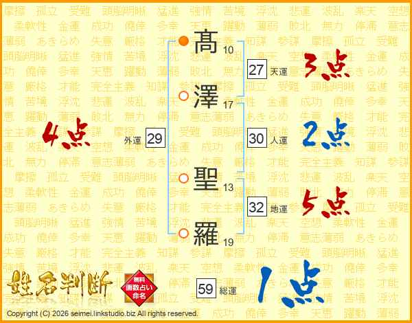 髙(10画)澤(17画) 聖(13画)羅(19画)