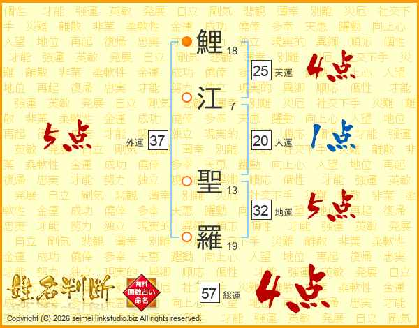 鯉(18画)江(7画) 聖(13画)羅(19画)