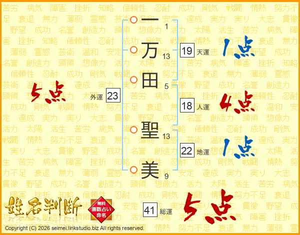一(1画)万(13画)田(5画) 聖(13画)美(9画)