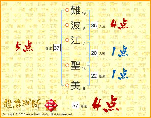 難(19画)波(9画)江(7画) 聖(13画)美(9画)