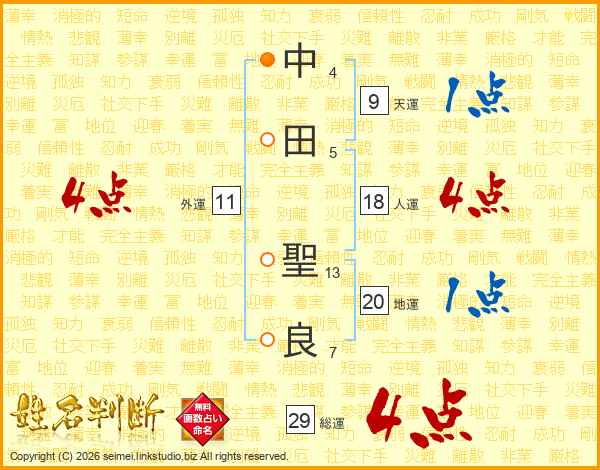 生活面を象徴する運勢です。外部から受ける影響力を表し、結婚運、家庭運や職場、環境への順応性を表します。総運から人運を引いた画数。姓や名が1文字の場合を除く。