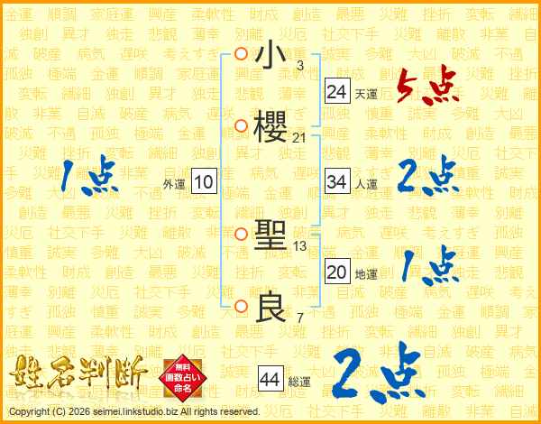 小(3画)櫻(21画) 聖(13画)良(7画)
