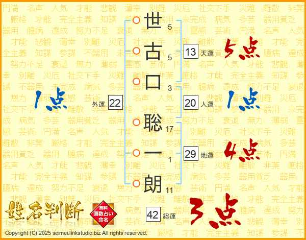 世(5画)古(5画)口(3画) 聡(17画)一(1画)朗(11画)