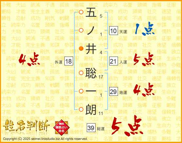 五(5画)ノ(1画)井(4画) 聡(17画)一(1画)朗(11画)