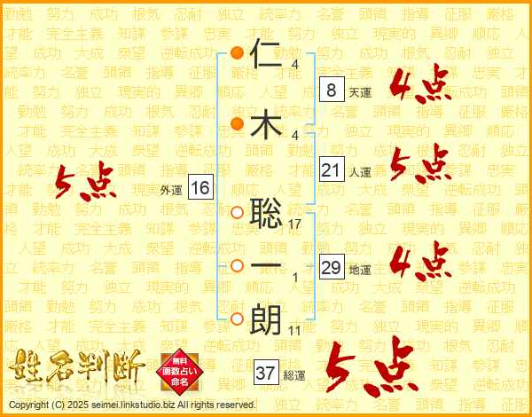 仁(4画)木(4画) 聡(17画)一(1画)朗(11画)