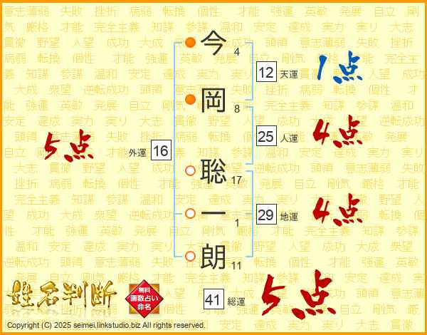 今(4画)岡(8画) 聡(17画)一(1画)朗(11画)