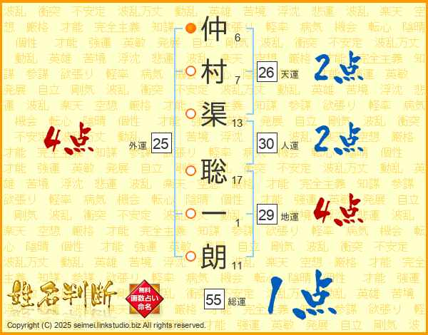 仲(6画)村(7画)渠(13画) 聡(17画)一(1画)朗(11画)