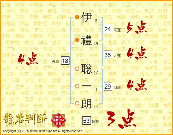 伊(6画)禮(18画) 聡(17画)一(1画)朗(11画)