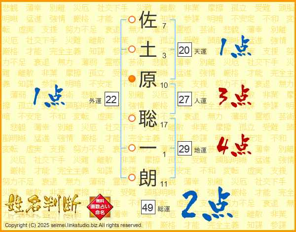 佐(7画)土(3画)原(10画) 聡(17画)一(1画)朗(11画)