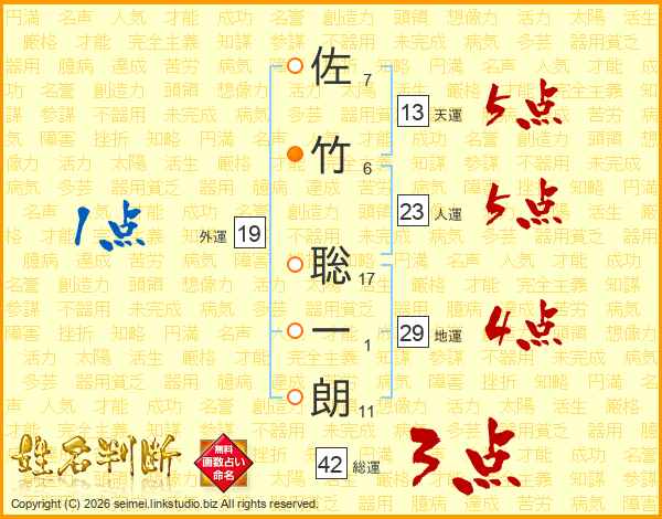 佐(7画)竹(6画) 聡(17画)一(1画)朗(11画)