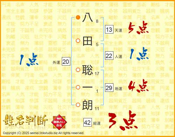 八(8画)田(5画) 聡(17画)一(1画)朗(11画)