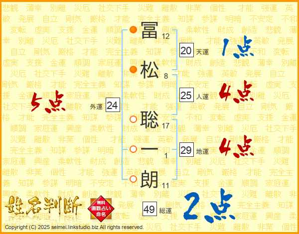 冨(12画)松(8画) 聡(17画)一(1画)朗(11画)