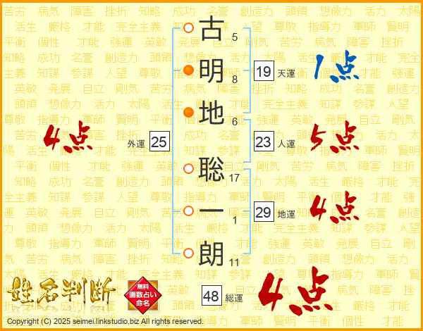 古(5画)明(8画)地(6画) 聡(17画)一(1画)朗(11画)