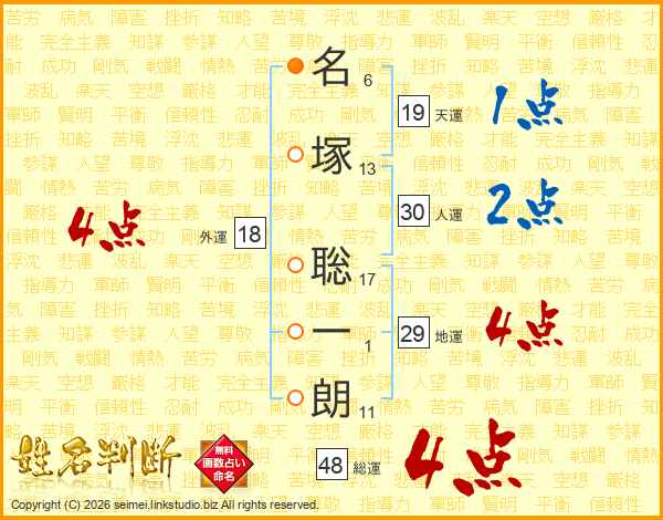 名(6画)塚(13画) 聡(17画)一(1画)朗(11画)